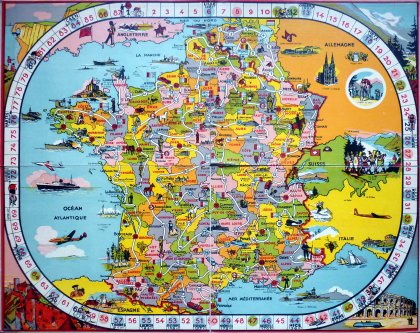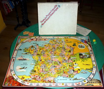 La grande boîte de Saussine contient deux jeux aux règles très proches. Tour de France cycliste se joue sur la piste autour de la carte de France, avec des petits vélos. On croirait un Jeu de l’oie, mais c'est encore plus pénible car beaucoup plus long. Il faut voir cette publication pour ce qu'il était : un jeu de hasard pur, adapté à quelques paris d'argent.