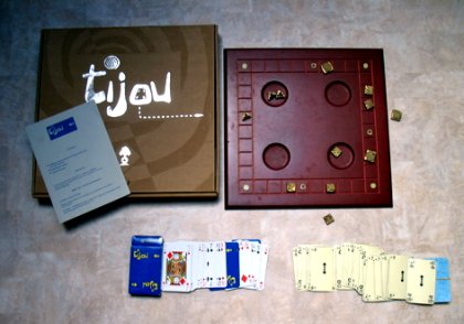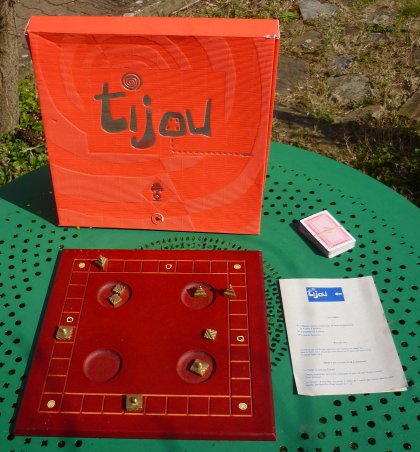 Tijou est clairement inspiré du Jeu de Tock. La piste du parcours a été réduite pour permettre des parties plus courtes. Le matériel, d'une exceptionnelle qualité avec son tablier en medium et ses pièces lourdes et dorées, invite à jouer. On ne s'en lasse pas facilement.