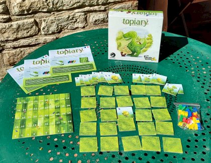 D'après Wikipédia, « l' art topiaire On crée des topiaires dans l'excellent et trop méconnu Sanssouci. Elles sont le thème principal du jeu Topiary, où les joueurs vont découvrir et admirer des alignements de topiaires de formes et de tailles variées. Plus ils en voient, plus vous marquez de points. Le mécanisme de comptage des points de Topiary, où les éléments de grande hauteur cachent les plus petits placés derrière, rappelle celui d'autres jeux : Vussuru, Skyliners, Arboria ou Photosynthesis. L'intérêt de Topiary réside dans la grande simplicité des règles, permettant de jouer rapidement et avec le même plaisir à 2, 3 ou 4 joueurs. Le hasard intervient un peu mais c'est surtout une bonne tactique qui permet d'emporter la victoire. Un grand petit jeu !
