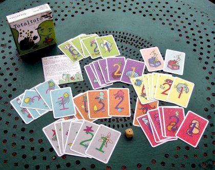 La règle la plus intéressante, à mon avis, est Le Jeu du total, descendant en droite ligne de Fermez la boîte. Chaque joueur reçoit, en début de manche, sept cartes qu'il place face visible devant lui. À son tour, on jette un dé et on peut rendre une ou plusieurs cartes dont le total est la valeur du dé. Si on ne peut rien rendre, on doit piocher, sinon on peut rejouer. La règle, très simple car adaptée aux très jeunes joueurs, peut facilement être modifiée pour ajouter une gestion de risque, comme dans Jeu de cochons ou Can’t Stop. Il suffit de décider que les cartes ne sont défaussées que si l'on décide d'arrêter de jouer avant de tirer un mauvais dé. Le jeu, joliment illustré par Hélène Chetaud, est servi dans un petit coffret en carton recyclé. |