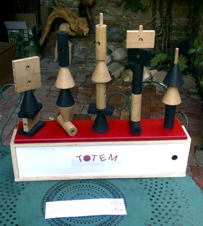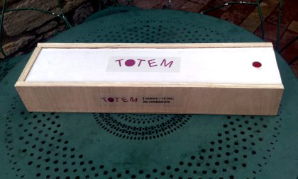 Totem méritait une édition géante qui a naturellement trouvé sa place dans les jeux géants de l'Escale à jeux (merci Philippe). Les cubes ont été remplacés par des cylindres mais la mécanique et les règles restent identiques