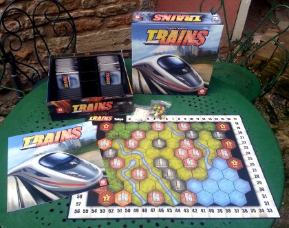 Trains réutilise le mécanisme inventé par Donald X. Vaccarino pour son jeu Dominion. La nouveauté, c'est l'apparition d'un plan de jeu où des rails (des cubes en bois) vont petit à petit rejoindre des villes où seront installées des gares (des colonnettes en bois). Il existe deux façons principales de gagner des points : atteindre des villes avec des gares et construire des bâtiments. Comme dans Dominion, les parties sont variées du fait de la présence d'une grande variété de cartes. Un regret : le jeu restera toutefois un peu limité, l'extension américaine n'étant visiblement pas prévue par l'éditeur francophone. Plans de jeu alternatifs
