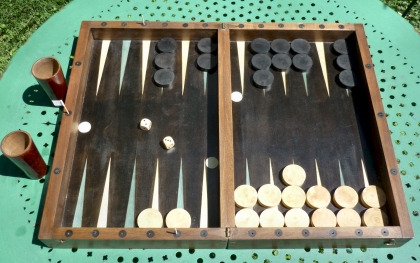 Le Grand Trictrac, Soumille, chez de Hansy, 1766, p. 14. Figure montrant l'emplacement des jetons en fonction des points marqués. 10 points se marquent en fait contre la bande. Les noirs ont 0 trou et 4 points, et les blancs n'ont encore rien marqué. (extrait de Wikipédia)