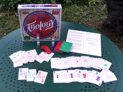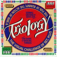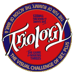 Contrairement à Set, on ne joue pas ici simultanément, mais à tour de rôle. La rapidité de réflexion est cependant primordiale, puisque vous ne disposez que de 3 minutes pour choisir entre prendre la carte de la pioche ou l'une de celles de la défausse, puis arranger vos cartes pour constituer des sets. Et parfois, les 3 minutes sont juste suffisantes pour choisir sa carte ! Un jeu brillant, mais nerveusement fatigant. Ambigramme par John Langdon