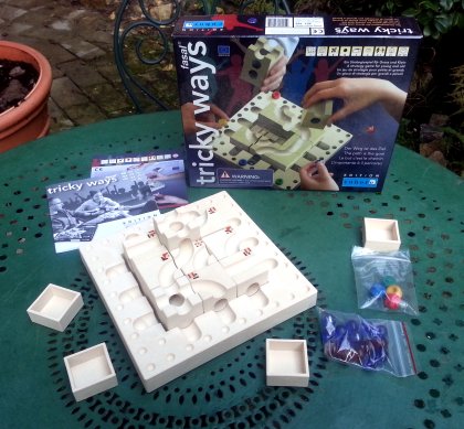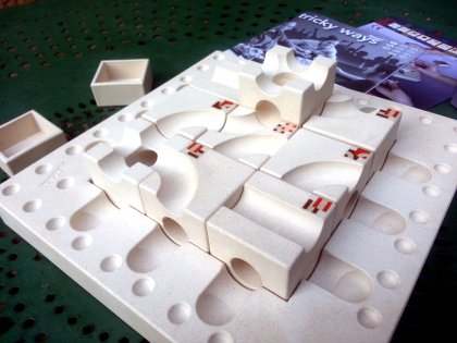 Les jeux ne manquent pas où vous devez créer un chemin passant par différentes pièces posées sur un tablier. Quand on ajoute la contrainte d'une structure en 3D, les candidats se font rares. Tricky Ways remplit donc une case presque vide (à l'exception de S.O.S. plombier et de l'excellent Passtah) de la classification de ma collection, celle des jeux où l'on doit créer des chemins en 3 dimensions. Tricky Ways propose deux règles de difficulté croissante. Dans la première règle, assez facile, les chemins ne passent que par la surface des cubes. C'est la deuxième règle qui donne tout son sel au jeu. L'un des cubes possède, comme la tour de lancement, une canalisation qui permet à la bille de descendre d'un niveau. Il est donc maintenant possible de créer un chemin qui passe par deux niveaux avant de terminer sa course dans l'une des cases du pourtour. Et là, ça devient très costaud !