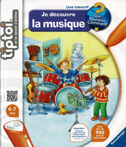 Tiptoi - Je découvre la musique est un livre interactif de la gamme « Qui Pourquoi Comment ». Au fil des pages, en promenant son crayon optique, l'enfant découvre des concepts, écoute des explications, des sons et des musiques. Il est aussi inviter à participer à des petits jeux. |
