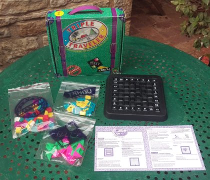 La boîte de Triple Traveler contient un livret avec trois règles, un tablier carré de soixante-quatre cases et trois sachets de pions.