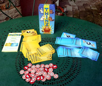 Twinz est une adaptation intéressante du même principe. Les joueurs vont être associés successivement deux à deux. Après avoir pris connaissance du mot à faire deviner, ils doivent chacun trouver un mot pour faire deviner le mot secret et l'annoncer ensemble. Ils n'ont pas le droit de se concerter ni celui d'annoncer le même mot. Ce qui, dans les faits, conduit souvent les joueurs à choisir un mot original. La tâche est d'autant plus difficile que l'auteur a — scientifiquement — sélectionné des mots qui ont peu de synonymes. Si aucun des autres joueurs ne trouve le mot secret, les compères ont droit à une deuxième chance. Ce qui donnera un total de quatre mots aux chercheurs. Mais si personne ne trouve au bout de ces deux essais, non seulement les compères ne gagnent pas de points mais ils en perdent ! Twinz parvient avec succès à transformer un jeu d'esprit en jeu d'ambiance. |