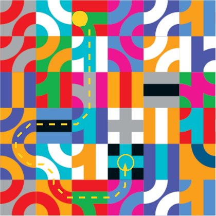 Il n'a pas le droit de tourner vers Nord ou Sud car le chemin ne tourne pas. Il peut cependant positionner son pion au centre de la tuile pour partir dans n'importe quelle direction lors de son prochain tour de jeu. Règle 2 : long déplacementAu lieu de réaliser trois actions, le joueur peut choisir de faire à la place un « long déplacement ». Il déplace son pion aussi-loin qu'il le souhaite en respectant les droites et courbes dessinées. Le joueur positionne précisément son pion sur la dernière tuile de son parcours et ne réalise aucune autre action à son tour. Exemple : Le pion est, au début de son tour, sur l'entrée Ouest de la tuile. Il peut effectuer un long déplacement vers Est (mais il n'ira pas bien loin) ou vers Sud. Il choisit de s'arrêter au centre de la tuile noire, ce qui lui offrira peut-être plus de possibilités lors de son prochain tour que s'il avait poursuivi jusqu'à la tuile suivante.