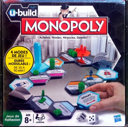 Il faut bien l'avouer, la collection U-Build de Hasbro n'a pas produit beaucoup de jeux inoubliables. U-Build Monopoly est peut-être l'exception. On n'est pas trop dépaysé : on retrouve en effet les mêmes idées que dans le jeu classique, mais pas mal de nouveautés valent le détour. Vous pouvez ainsi choisir la taille et la difficulté du jeu, donc sa durée probable. Des nouveaux bâtiments, bénéfiques ou nuisibles, vont protéger vos investissements ou les gêner. On apprend ainsi que la présence d'une prison aurait tendance à dévaloriser vos résidences, tandis qu'un stade les valorise. J'ai personnellement habité à côté d'une prison puis d'un stade, et je pense que le stade est beaucoup plus gênant… U-Build Monopoly est rapidement devenu introuvable. Si vous tombez dessus, ne le manquez pas.