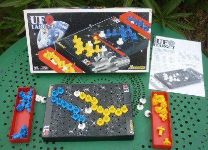 UFO Target fait un peut penser à Track, un jeu particulièrement sans intérêt publié dix ans auparavant. Ici, cependant, les axes d'engrenages sont posés selon un réseau triangulaire. On n'est donc pas à l'abri d'un blocage. Le but est de relier la chaîne adverse avant que celle-ci ne le fasse. La seule protection possible, quand l'adversaire avance trop près, est de poser un pirate blanc qui arrête sa progression. Le problème, c'est que les pirates nous gênent également, et la partie devient interminable. La seule façon de gagner doit consister à attendre que l'adversaire propose de jouer à autre chose : on gagne alors par abandon ! Sur la même base logique, essayez plutôt Mecanix qui, lui, est réussi.