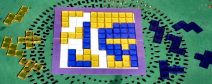La partie est terminée, puisqu'aucun espace libre ne permet de poser une pièce sans contrevenir à la règle. Bleu, qui a posé neuf pièces, a gagné la partie.