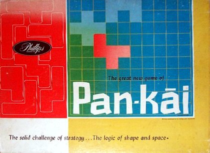 Pan-Kai, publié en 1960 chez Philips, est proposé pour deux joueurs. Il se compose d'un tablier carré de cent cases et de deux jeux de douze pièces, les fameux pentaminos. Les règles sont extrêmement simples. Règle du jeuPréparationAu départ le tablier est vide. Chaque joueur reçoit un ensemble identique de 12 pièces, les pentaminos. But du jeuLe premier joueur qui ne peut pas jouer a perdu. Déroulement du jeuÀ tour de rôle, les joueurs choisissent et placent une pièce de leur couleur. La pièce doit être posée sur des cases libres. Elle peut toucher ou non une pièce déjà posée. Il faut respecter la contrainte suivante : lorsqu'un espace fermé est créé par la pose d'une pièce, cet espace ne peut être inférieur à cinq cases. En clair, il est impossible de poser une pièce dans un espace comportant de 6 à 9 cases, car cela créerait un espace inférieur à cinq cases.