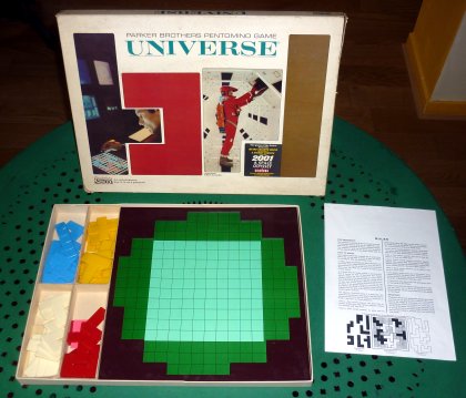 Dans la partie ci-dessus, c'est à Bleu de jouer, mais il ne peut poser aucune de ses pièces. Jaune a donc gagné. 1966 : Universe chez ParkerEn 1966, le jeu a été repris par Parker Brothers. Il s'adresse maintenant à deux, trois ou quatre joueurs, mais les règles restent inchangées. La forme du tablier dépend du nombre de joueurs. À deux, trois ou quatre, on joue sur respectivement cent, cent cinquante ou deux cents cases :