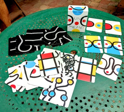 Plus qu'un jeu, Un mémo est un matériel permettant de jouer au classique jeu des paires, mais aussi de laisser aller son imagination. Chaque carton épais est dessiné sur les deux faces, l'une avec des motifs colorés, l'autre avec des chemins blancs sur fond noir.