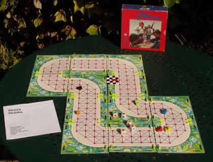 Le jeu se révèle un vrai plaisir à jouer en famille. Les plus jeunes peuvent facilement s'initier à combiner les dés pour aller le plus loin possible, ainsi qu'à gérer le risque : faut-il jeter encore un dé ? Est-il prudent d'en jouer deux ? Le jeu est malheureusement épuisé depuis longtemps et introuvable. Vous pourrez facilement vous réaliser une copie personnelle, pour découvrir en famille les joies de la course automobile. Victory est à mon avis l'un des meilleurs jeux de course, à classer aux côtés des plus grands. |