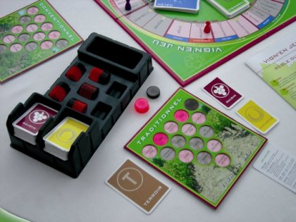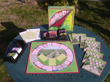 Si le hasard a une part non négligeable, c'est essentiellement la qualité de votre exploitation qui vous permettra de gagner. Vign'en jeu a su éviter les travers du « jeu éducatif » (souvent synonyme d'ennui). Très agréable à jouer en famille, il nous en apprend cependant un peu plus sur l'un des plus beaux métiers traditionnels français. Extension 2008La première édition épuisée, Gilles Bourjade a décidé d'ajouter une règle optionnelle complémentaire dans la seconde édition de 2008 : « la partie payante ». Non pas que vous allez jouer de l'argent, mais chacune des opérations se voit maintenant affectée d'un coût, et c'est l'effet positif ou négatif de la météo en fonction des saisons qui influencera votre budget pour les payer. Si vous avez acheté la première boîte, on ne vous a pas oublié : l'auteur