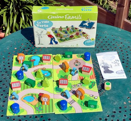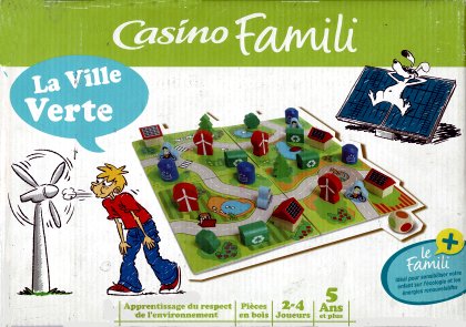 La Ville verte est un simple jeu de dé. Selon la couleur qui apparaît sur le dé, le joueur actif peut poser un arbre, un poubelle de tri, une maison avec des panneaux photovoltaïques, un vélo ou une cuve de récupération des eaux dans son quartier de la ville. Si l'équipement est déjà placé dans votre quartier, vous devez donner le dé à un joueur qui pourra en bénéficier. Règle minimaliste, joli matériel et bons sentiments : un jeu conçu pour les parents