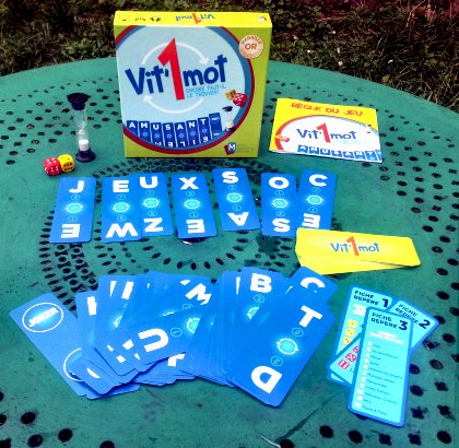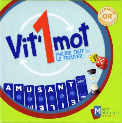 On ne compte pas les jeux proposant de former des mots à partir de cartes-lettres. Il cependant est rare de trouver un mécanisme ou une règle originale. Avec Vit’1mot, Martin Malermme nous propose une idée intéressante : chaque carte comporte deux lettres et il est possible de les tourner pour en tirer le meilleur parti. Il est déjà peu aisé d'anagrammer des lettres pour trouver un mot. Mais quand vous ajoutez la possibilité de choisir le côté de chaque carte, vous vous retrouvez avec avec un nombre de possibilités considérablement accru. Le sablier, lui, continue à couler normalement ! Vit’1mot est proposé avec trois niveaux de jeu. Dans le premier, chacun est libre de composer les mots de son choix. Le second niveau propose le type de mots : verbe, nom commun, adjectif… Le second niveau pêche cependant par ses catégories. Un 2 au dé demande de créer des verbes. Un 4 demande de former des participes, qui sont aussi des verbes si mes restes de grammaire sont bons. Le tirage d'un 5 est le plus problématique puisqu'il demande un mot qui ne soit ni un nom commun, ni un verbe, ni un adjectif : il ne reste guère comme possibilité que les adverbes et quelques pronoms, conjonctions, prépositions ou déterminants. La règle précise que les locutions sont admises mais je suis plus que réticent : toujours selon mes souvenirs d'école, les locutions sont des groupes de mots ; ce ne sont donc pas des mots, à proprement parler. Le troisième niveau, certainement le plus intéressant, propose un thème aux mots formés par les joueurs. Il n'est jamais obligatoire de respecter le type de mot ou le thème tiré en début de manche, mais on perd alors une prime fort rémunératrice. Celui qui parvient à trouver un mot complet sans changer ses cartes touche une double prime. Sinon, à l'issue du premier sablier, il est possible de changer des cartes avant de lancer un second sablier. Le dilemme existe parfois entre créer un mot complet peu rémunérateur dès le premier tour de jeu, ou tenter le diable en espérant toucher au deuxième tour des cartes qui permettront de valoriser des lettres chères. Sachant que chaque carte inutilisée fera perdre la valeur de la plus chère de ses deux lettres ! Vit’1mot renouvelle agréablement les jeux de lettres avec cette astuce des cartes doubles.