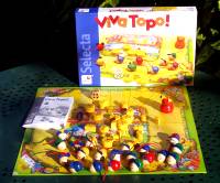 Viva Topo ! est un jeu de parcours et de prise de risques, qui n'est pas sans rappeler le fameux Le Fantôme de minuit. Chacun essaye d'amener ses souris le plus en avant possible pour croquer les plus gros morceaux de fromage. Au début du parcours, il est possible de se réfugier dans une cachette qui permet de gagner un morceau de fromage. Un peu plus loin, un refuge permet d'en gagner deux, un autre trois, un autre enfin quatre morceaux. Les souris qui réussissent à atteindre l'arrivée gagnent un fromage complet, constitué de six morceaux. À chaque tour, on jette le dé et on avance l'une de ses souris du nombre indiqué. Mais si le chat apparaît sur le dé, alors le matou avance et croque les souris retardataires. Le problème de Viva Topo ! c'est que le mécanisme et le matériel ne sont pas du même niveau d'âge. Alors que la boîte, les illustrations et les jolies souris en bois s'adressent sans aucun doute aux enfants de 4 ans, la règle assez complexe et les décisions quasiment statistiques à prendre en font un jeu pour les plus âgés. Si le titre a été élu meilleur jeu pour enfant par le jury du Spiel des Jahres, je ne suis pas sûr que les plus jeunes ne le trouvent pas un peu trop compliqué pour eux. Peu importe ! Les grands s'en empareront et seront ravis de jouer à un jeu qui certes relève du hasard, mais surtout de la prise de risques. Personnellement, j'adore ce genre de jeu qui met beaucoup d'ambiance. 2015 : réédition chez Éditions du Matagot