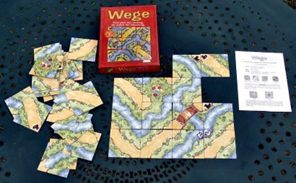 J'ai toujours aimé les jeux topologiques dans lesquels on crée des terrains ou des paysages. Wege vous offre la possibilité de fabriquer des réserves naturelles — plutôt des marais pour être clair — avec des canards dedans. Un joueur devra construire un chemin de terre et son adversaire un chemin d'eau. Le titre allemand (Wege = routes) ne ment pas sur le but du jeu : il convient en effet de tracer des routes. Comme tout ceci est trop simple et qu'il convient d'être écologique et romantique, les joueurs auront à cœur de ne pas séparer les couples de canard. Ajoutons la contrainte de ne pas voisiner une île ou un étang fermé. C'est un bon petit jeu pour ceux qui aiment le genre, mais pas de quoi faire 36 parties de suite. Les règles sont fort simples et vite apprises. La règle propose quelques variantes et il est facile d'en inventer. Comme jeu d'apéritif, histoire de s'amuser 15 minutes maxi, sans se bousiller la moitié des neurones, Wege est bien placé. |