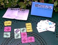 Pour Xochintlan, l'auteur a eu une idée simple et lumineuse : plutôt que de jouer avec les pentaminos, on va jouer à les fabriquer. Voici donc huit pièces carrées en trois couleurs, et une pièce carrée neutre. Dans le thème choisi, il s'agit de lézards, d'oiseaux et de singes, tandis que la pièce neutre est l'homme. Chaque joueur reçoit une carte d'objectif représentant un pentamino, et doit reconstituer ce pentamino avec l'homme et quatre pièces de la même couleur. À chaque tour, un joueur peut introduire une pièce de la réserve, remplacer une pièce par une autre ou déplacer l'homme. S'il atteint alors son objectif, il dévoile sa carte et gagne un point. Ceux qui aiment la difficulté peuvent jouer à objectif découvert. |