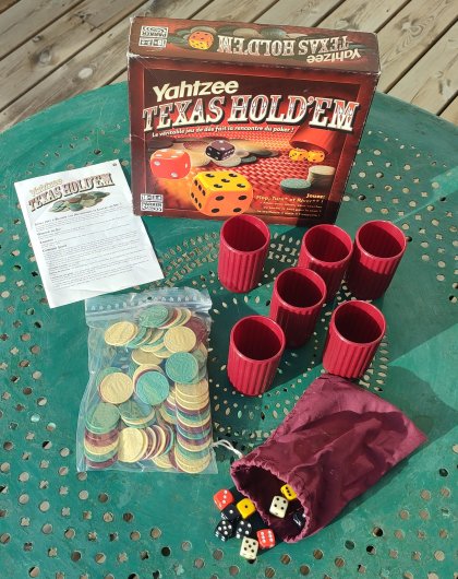 Vous aimez jouer au Texas Hold'em Poker mais malheureusement vous avez oublié de prendre un jeu de 52 cartes. Par chance, l'un d'entre vous a dans sa (grande) poche une boite de Yahtzee Texas Hold’em ! Les règles – que personne n'a osé signer – sont en gros celles du jeu de cartes, sauf qu'au lieu de cacher deux cartes, on cache deux dés sous un gobelet. L'intérêt, c'est que c'est beaucoup plus volumineux et que ça rapporte plus à l'éditeur qu'un simple jeu de cartes.