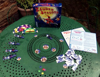 Le mécanisme principal de Zauber Stauber faut un peu penser à celui utilisé par Jean du Poël dans ses jeux Ben Hur et Drachenreiter. Ici, les joueurs sont des sorciers volant entre des châteaux pour gagner des courses ou remporter le plus de points de victoire selon le scénario choisi. À son tour, le joueur actif a le choix entre ajouter un vecteur à son planning de vol, soit utiliser le ou les vecteurs qu'il a programmés. Toute la difficulté réside dans l'évaluation des trajectoires car vous n'avez pas le droit d'essayer les vecteurs avant de les sélectionner. Amusant, surtout si vous avez une bonne vision dans l'espace.