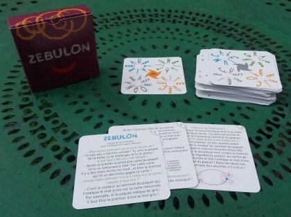 Zebulon est le premier titre sorti chez Flip Flap éditions. Il se présente comme un petit jeu de cinquante-cinq cartes à deux faces. Chaque face comporte quatre mots écrits en rond, en quatre couleurs : bleu, gris, vert et jaune. Le début et la fin du mot ne sont pas signalés. Et on ne sait pas dans quel sens tourne le mot. Au centre de la carte, un symbole coloré dans l'une des quatre couleurs. C'est le symbole au-dessus du paquet qui détermine quel mot est à trouver dans la carte découverte. Le plus rapide gagne la carte !